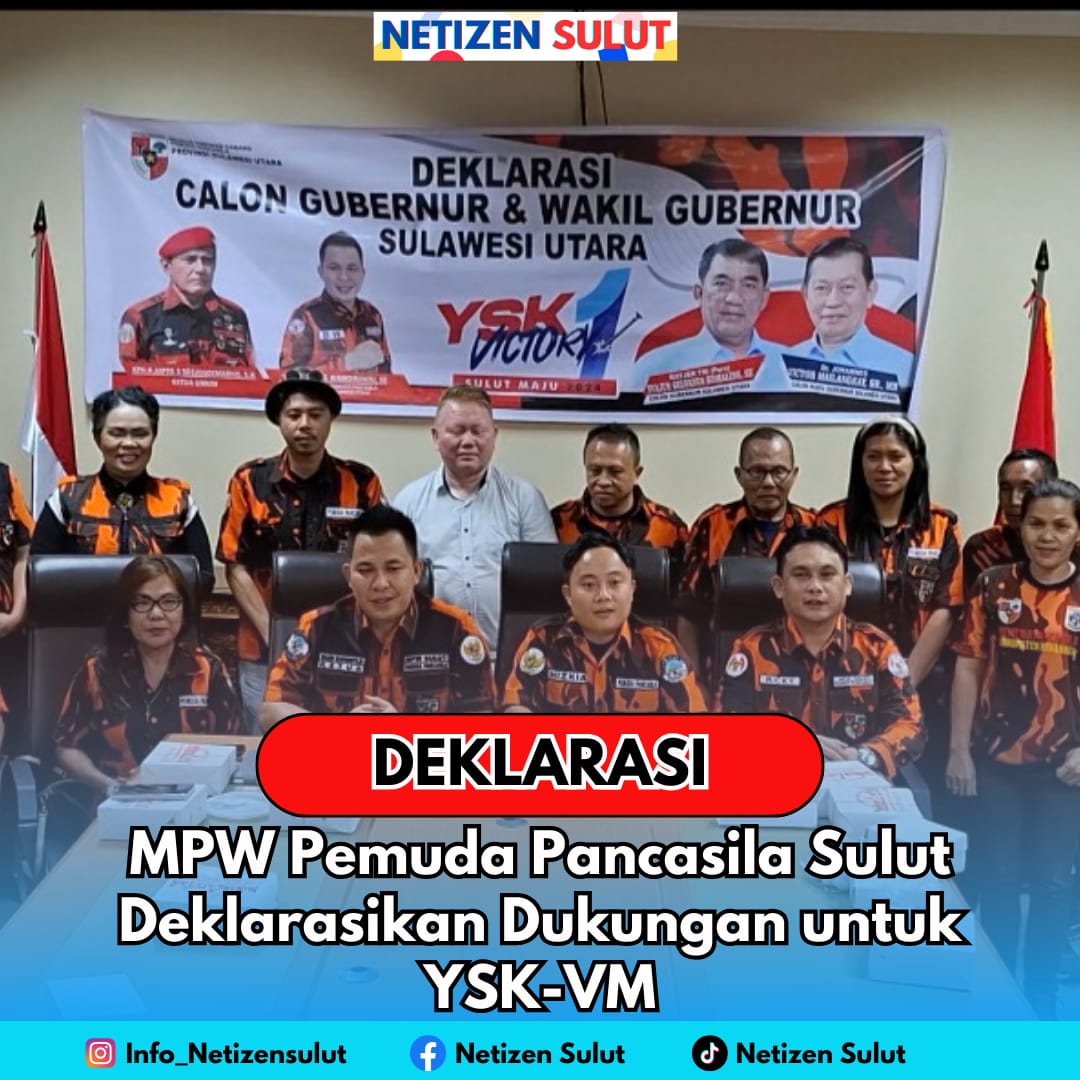 Organisasi Kemasyarakatan atau Ormas Pemuda Pancasila Wilayah Sulawesi utara menyatakan dukung terhadap Pasangan Calon Gubernur dan Wakil Gubernur Provinsi Sulawesi utara Yulius Selvanus Komaling dan Victor Mailangkay (YSK-VM) dalam Pilgub Sulut tahun 2024.