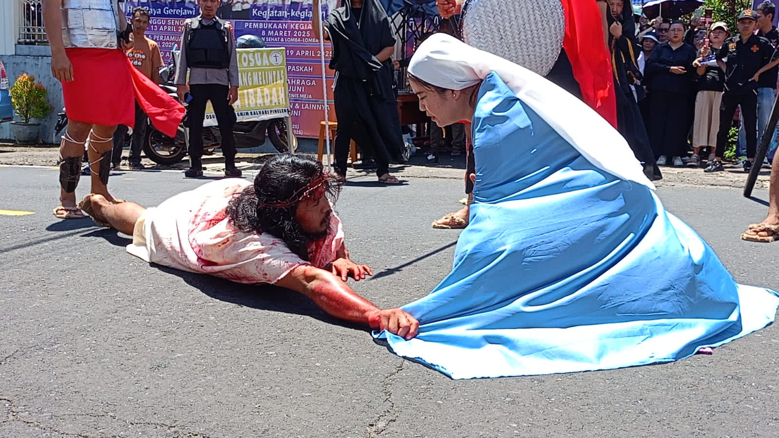 Aksi ini turut menyita perhatian umat yang hadir saat ikut jalan salib. Umat tumpah rua mengelilingi Desa Pineleng hingga finish di halaman gereja sebagai lokasi ‘Bukit Golgota’.