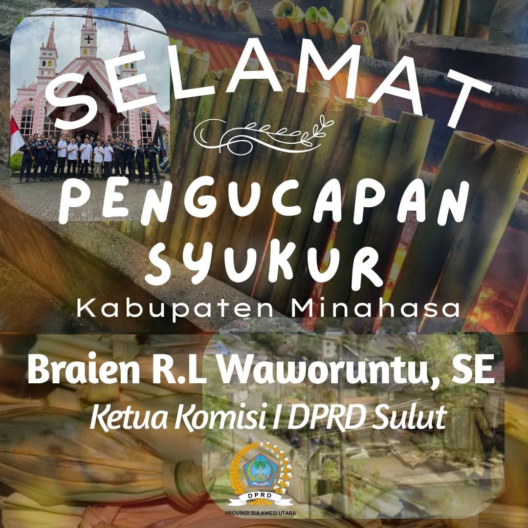 Netizensulut.com, SULUT – Ketua Komisi I DPRD Provinsi Sulawesi Utara, Braien Waworuntu, menyampaikan ucapan selamat merayakan Pengucapan Syukur kepada seluruh masyarakat Kabupaten Minahasa.