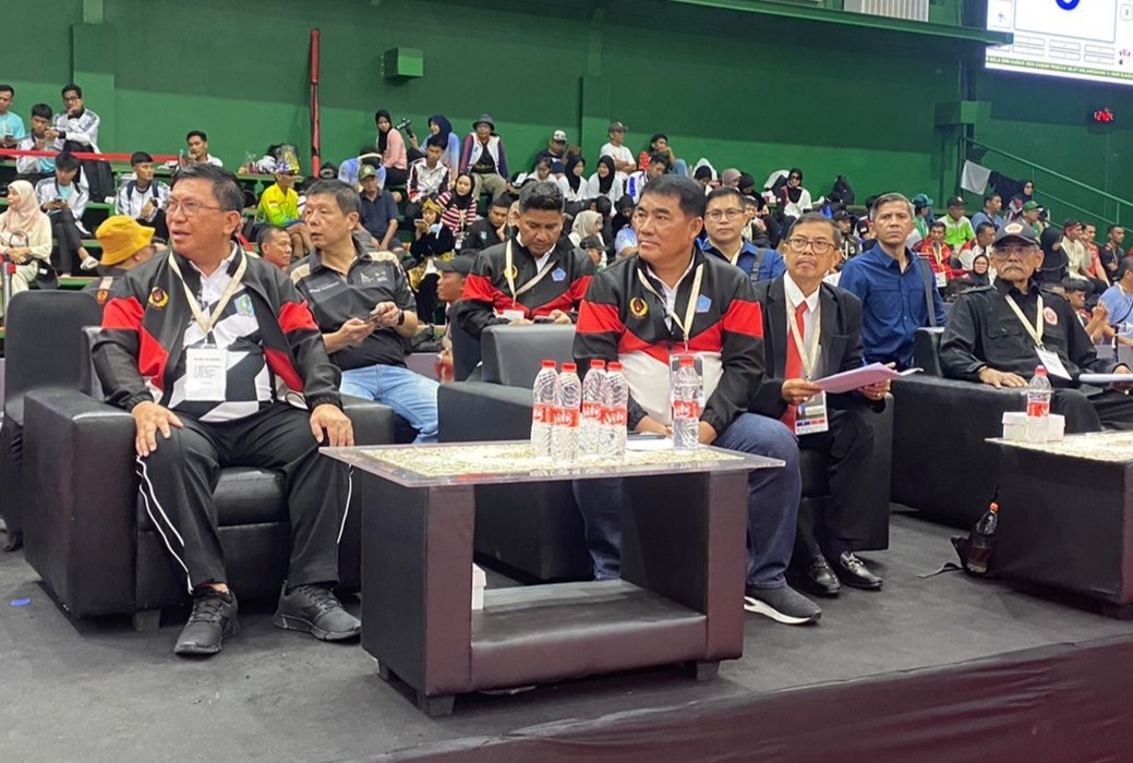 Terlihat, di arena lomba, Gubernur Yulius Selvanus menyaksikan langsung perjuangan para atlit bela diri Sulut berlomba.