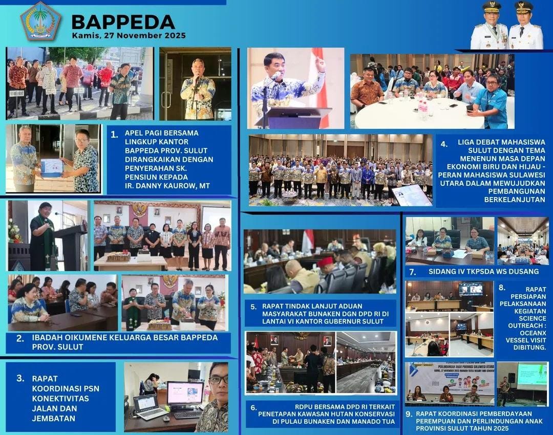 Netizensulut.com, MANADO – Badan Perencanaan Pembangunan Daerah (BAPPEDA) Provinsi Sulawesi Utara (SULUT) menggelar serangkaian kegiatan strategis dan koordinasi penting pada hari Kamis, 27 November 2025.