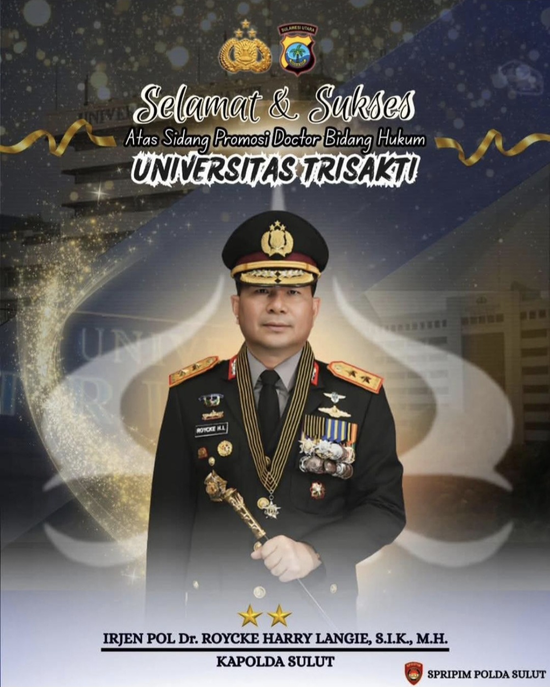 Kepala Kepolisian Daerah (Kapolda) Sulut, IRJEN POL Dr. ROYKE HARRY LANGIE, S.I.K., M.H., secara resmi menyandang gelar Doktor di bidang Ilmu Hukum setelah berhasil mempertahankan disertasinya dalam Sidang Promosi Doktor di Universitas Trisakti, Jakarta.