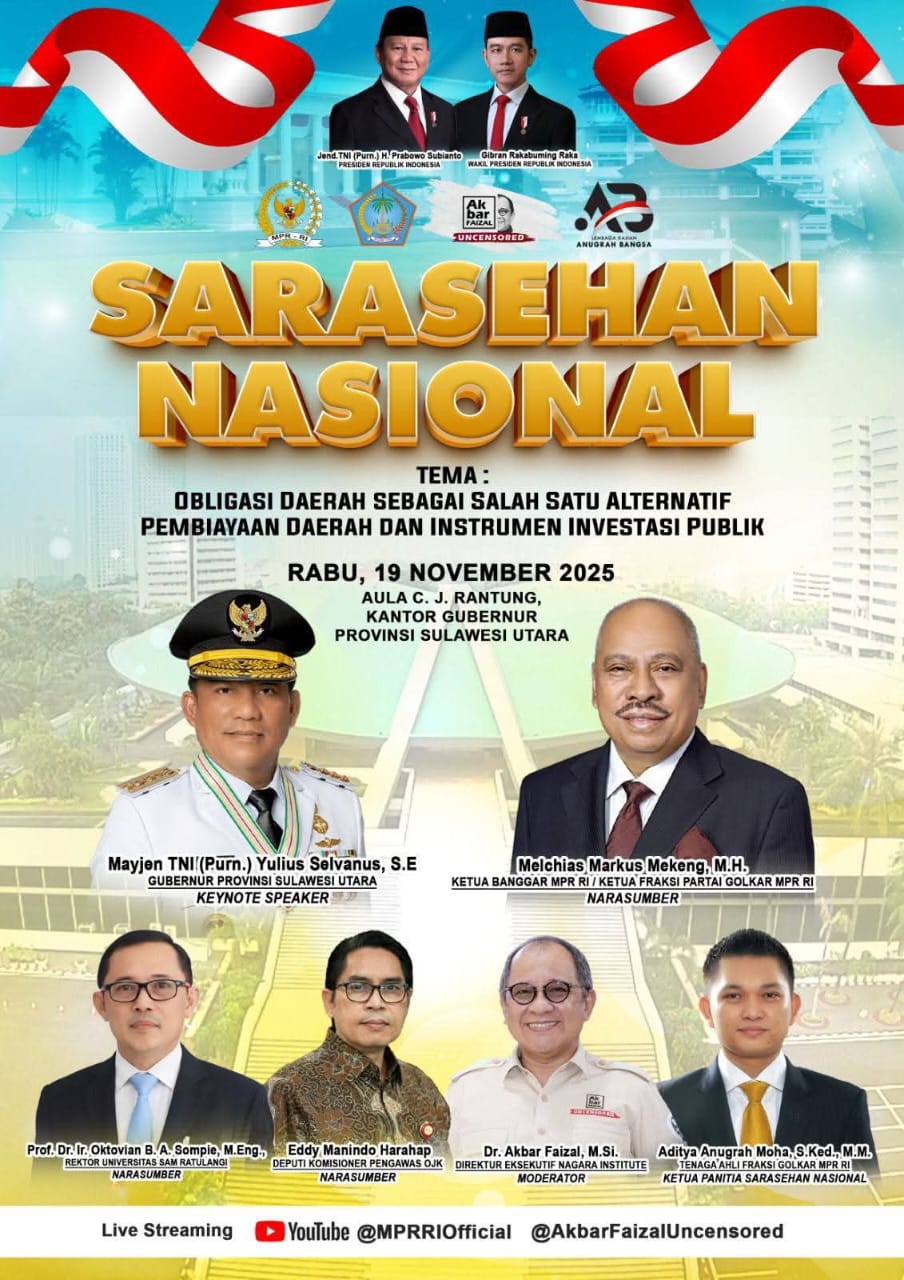 Gubernur Sulut Yulius Selvanus menjadi Keynote speaker dalam Acara tersebut, dengan Narasumber utama Ketua FPG MPR RI, Melchias Markus Mekeng, juga Narasumber lainnya, Rektor Unsrat, Dr. Oktovian Sompie, Deputi Komisioner Pengawas OJK, Eddy Manindo Harahap, dan Moderator Akbar Faizal.