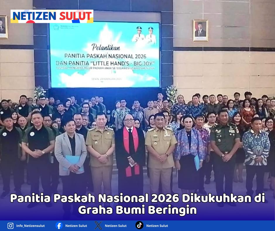 Netizensulut.com, Manado – Panitia Paskah Nasional yang diketuai Recky Langie dan Sekretaris Brillian Charles resmi dilantik oleh Ketua Badan Pekerja Sinode GMIM, Pdt DR. Adolf Katuuk-Wenas didampingi Gubernur Sulut Yulius Selvanus Komaling (YSK) dan Wagub Viktor Mailangkay, Senin (23/02/2026) sekitar pukul 11.00 Wita bertempat di Graha Bumi Beringin.