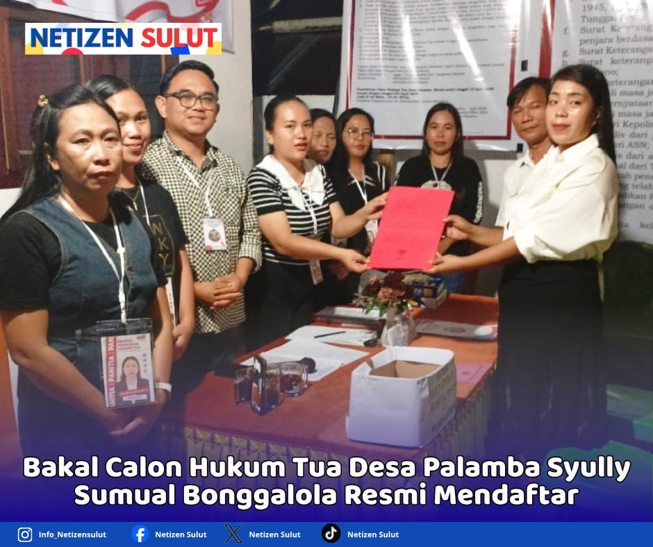 Dengan tersenyum, Syully mulai melakukan registrasi dan menyerahkan persyaratan sebagai bakal calon hukum tua di hadapan para panitia pada pukul 20.00 Wita, Sabtu (18/04/2026).