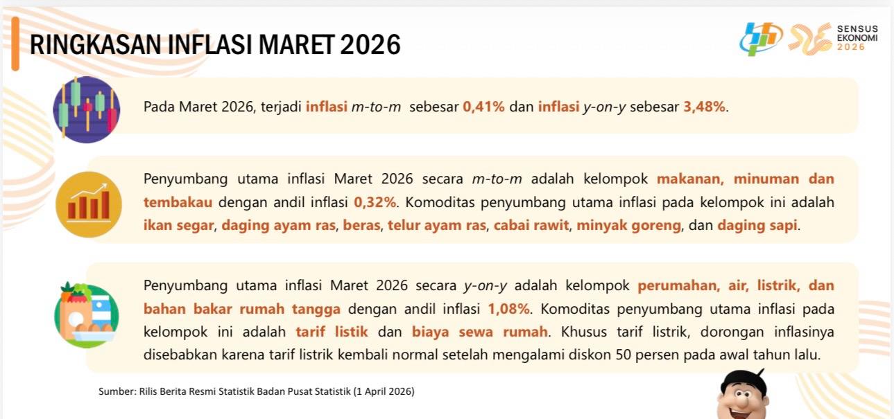 Data BPS menunjukkan bahwa pada Maret 2026, “Inflasi Month-to-Month (m-to-m): Tercatat sebesar 0,25%.”